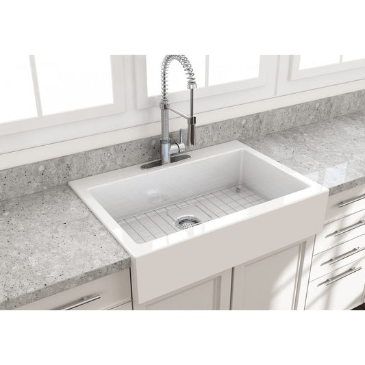 Nuova Apron Front Drop-In Fireclay 34 in. Single Bowl Kitchen Sink with Protective Bottom Grid and Strainer in White