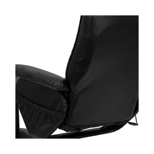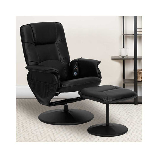 Massaging Multi-Position Plush Recliner with Side Pocket and Ottoman in Black LeatherSoft