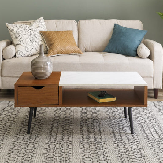 Juniper Mid Century Modern Faux Marble Coffee Table - Pecan