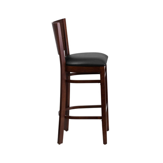 Lacey Series Solid Back Walnut Wood Restaurant Barstool - Black Vinyl Seat