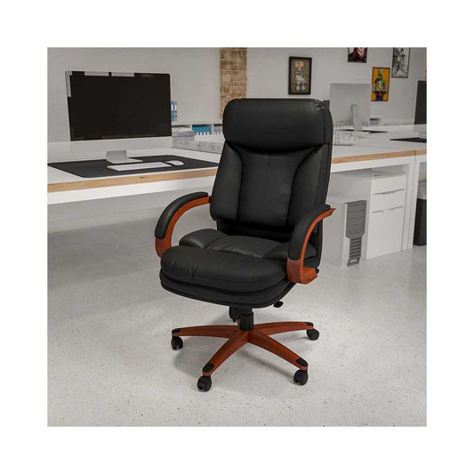 High Back Black LeatherSoft Executive Ergonomic Office Chair with Synchro-Tilt Mechanism, Mahogany Wood Base and Arms