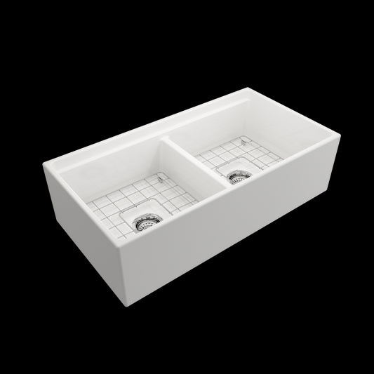 Contempo Apron Front Step Rim with Integrated Work Station Fireclay 36 in. Double Bowl Kitchen Sink with Accessories in White