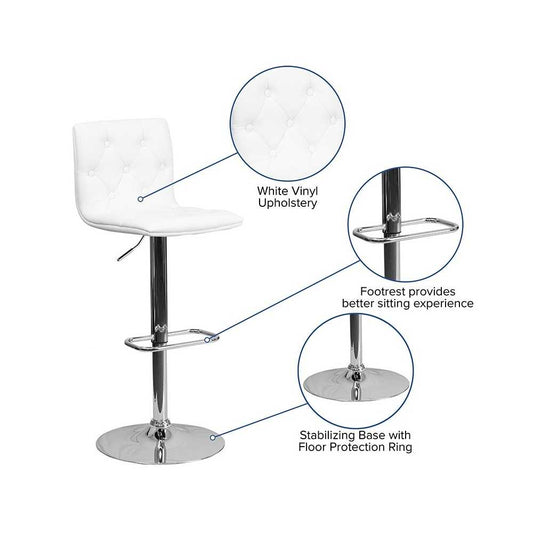Contemporary Button Tufted White Vinyl Adjustable Height Barstool with Chrome Base
