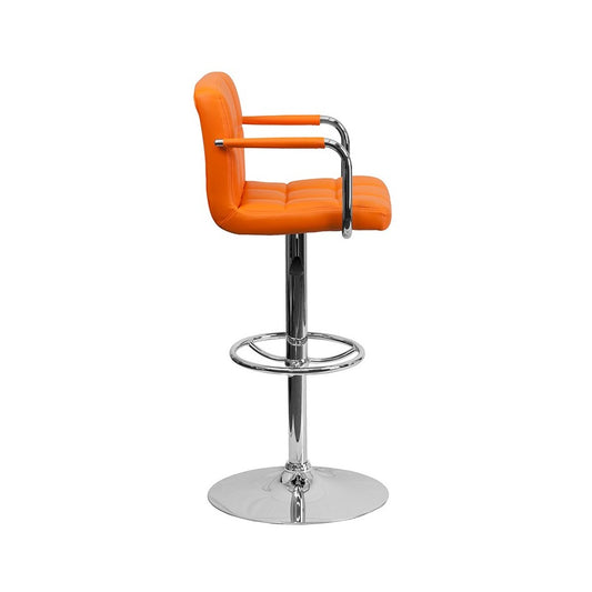 Contemporary Orange Quilted Vinyl Adjustable Height Barstool with Arms and Chrome Base