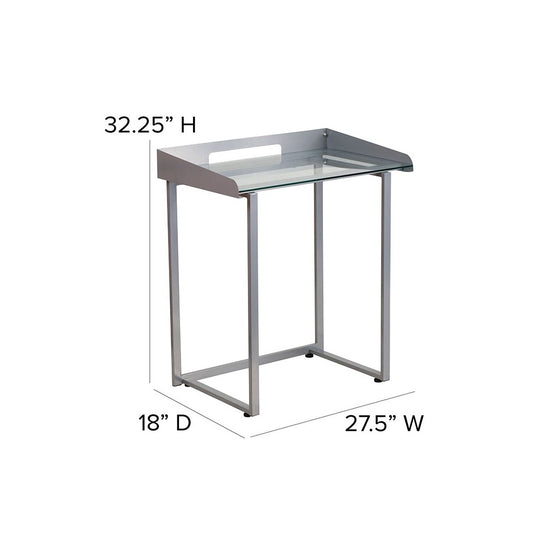 Contemporary Clear Tempered Glass Desk with Raised Cable Management Border and Silver Metal Frame