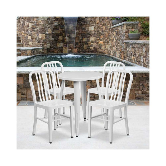 Commercial Grade 24" Round White Metal Indoor-Outdoor Table Set with 4 Vertical Slat Back Chairs