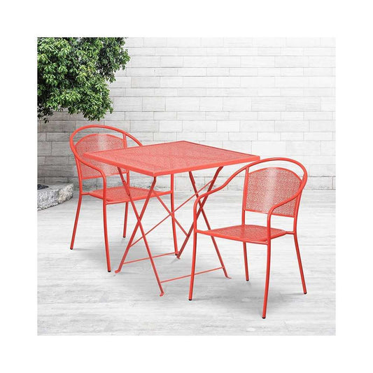 Commercial Grade 28" Square Coral Indoor-Outdoor Steel Folding Patio Table Set with 2 Round Back Chairs