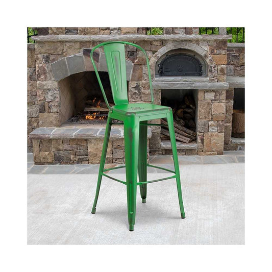 Commercial Grade 30" High Distressed Green Metal Indoor-Outdoor Barstool with Back