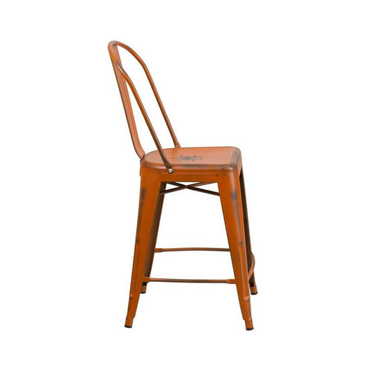 Commercial Grade 24" High Distressed Orange Metal Indoor-Outdoor Counter Height Stool with Back