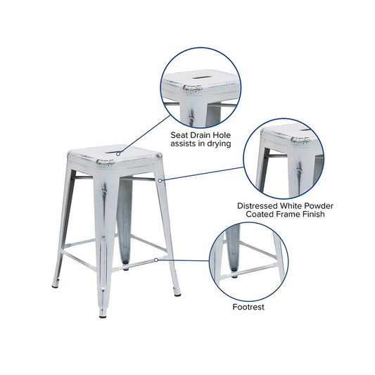 Commercial Grade 24" High Backless Distressed White Metal Indoor-Outdoor Counter Height Stool