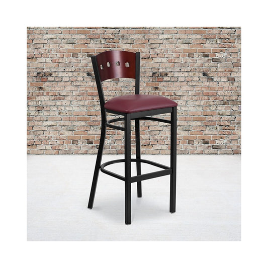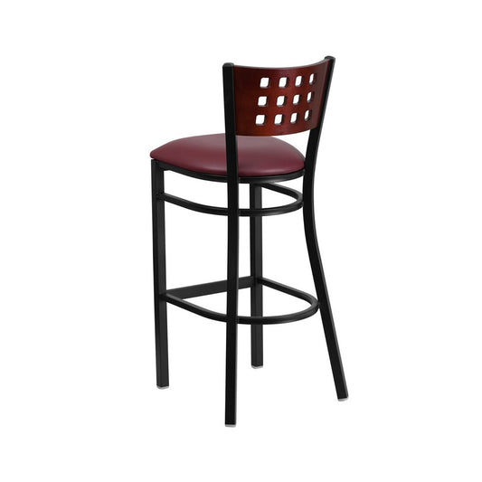 Black Cutout Back Metal Restaurant Barstool - Mahogany Wood Back, Burgundy Vinyl Seat