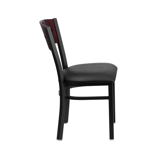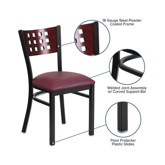 Black Cutout Back Metal Restaurant Chair - Mahogany Wood Back, Burgundy Vinyl Seat