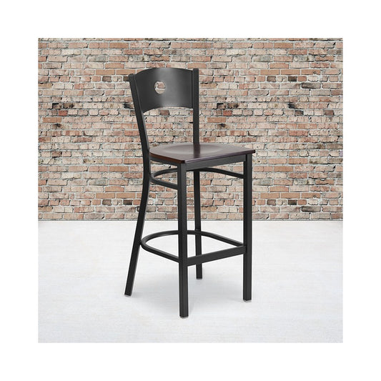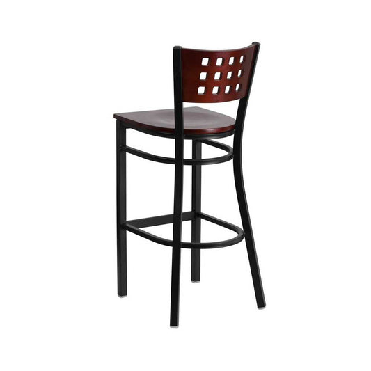 Black Cutout Back Metal Restaurant Barstool - Mahogany Wood Back & Seat