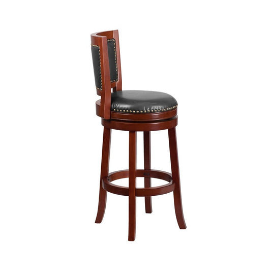 30'' High Dark Cherry Wood Barstool with Open Panel Back and Walnut LeatherSoft Swivel Seat