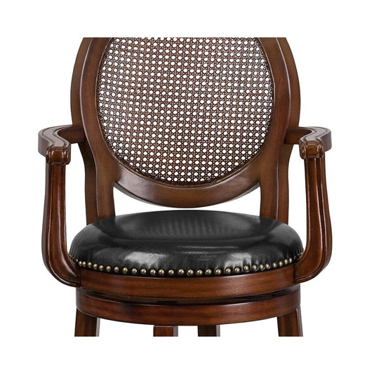 30'' High Expresso Wood Barstool with Arms, Woven Rattan Back and Black LeatherSoft Swivel Seat