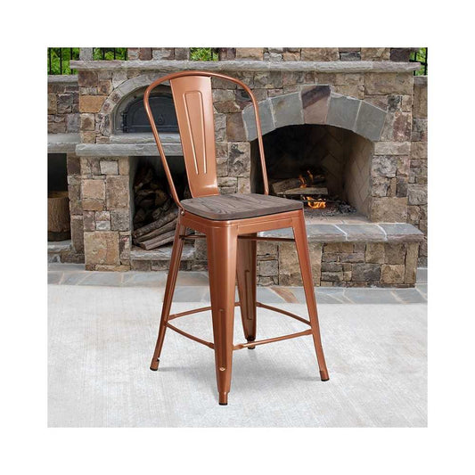 24" High Copper Metal Counter Height Stool with Back and Wood Seat