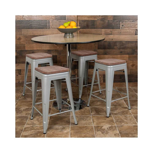 24" High Metal Counter-Height, Indoor Bar Stool with Wood Seat in Silver - Stackable Set of 4