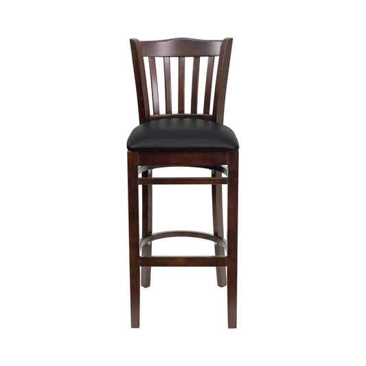 Vertical Slat Back Walnut Wood Restaurant Barstool - Black Vinyl Seat