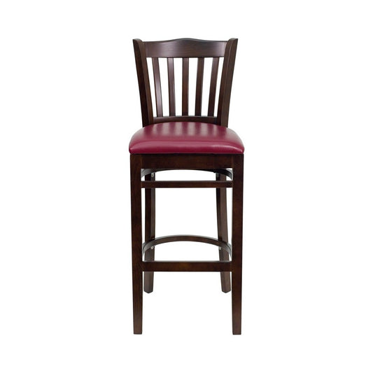 Vertical Slat Back Walnut Wood Restaurant Barstool - Burgundy Vinyl Seat
