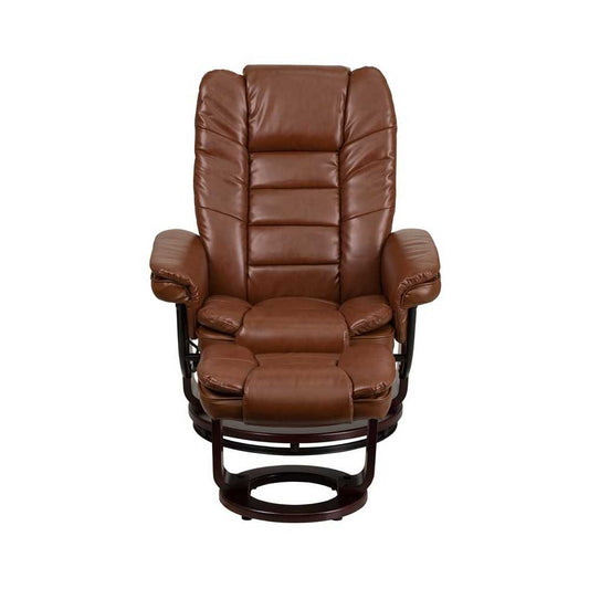 Multi-Position Recliner with Horizontal Stitching and Ottoman with Swivel Mahogany Wood Base in Brown Vintage Leather