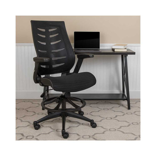 High Back Black Mesh Spine-Back Ergonomic Drafting Chair with Adjustable Foot Ring and Adjustable Flip-Up Arms