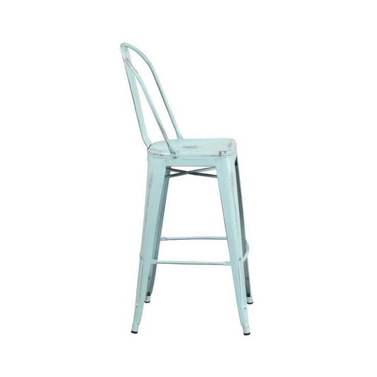 Commercial Grade 30" High Distressed Green-Blue Metal Indoor-Outdoor Barstool with Back