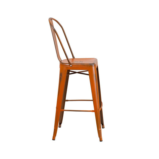 Commercial Grade 30" High Distressed Orange Metal Indoor-Outdoor Barstool with Back