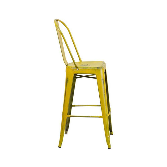 Commercial Grade 30" High Distressed Yellow Metal Indoor-Outdoor Barstool with Back