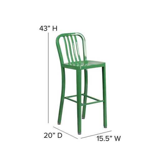 Commercial Grade 30" High Green Metal Indoor-Outdoor Barstool with Vertical Slat Back
