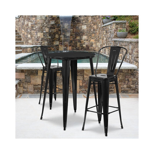 Commercial Grade 30" Round Black Metal Indoor-Outdoor Bar Table Set with 2 Cafe Stools