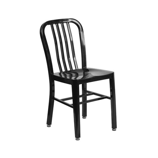 Commercial Grade 30" Round Black Metal Indoor-Outdoor Table Set with 4 Vertical Slat Back Chairs