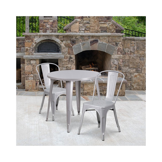 Commercial Grade 30" Round Silver Metal Indoor-Outdoor Table Set with 2 Cafe Chairs