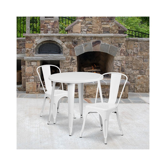 Commercial Grade 30" Round White Metal Indoor-Outdoor Table Set with 2 Cafe Chairs