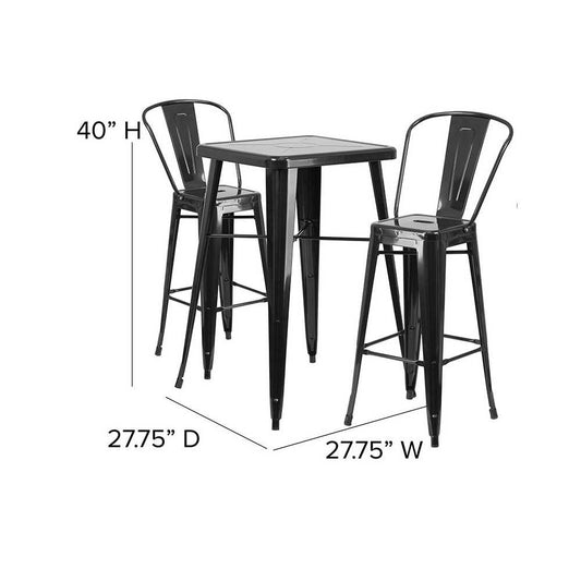 Commercial Grade 23.75" Square Black Metal Indoor-Outdoor Bar Table Set with 2 Stools with Backs