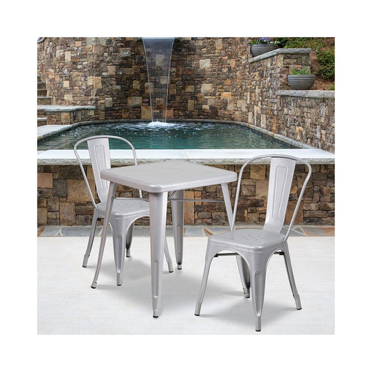 Commercial Grade 23.75" Square Silver Metal Indoor-Outdoor Table Set with 2 Stack Chairs