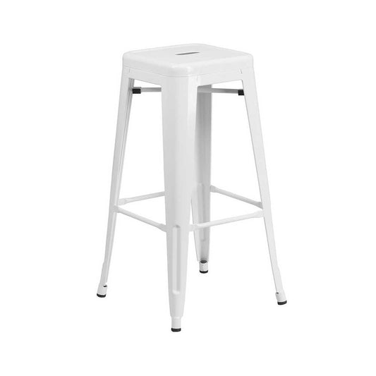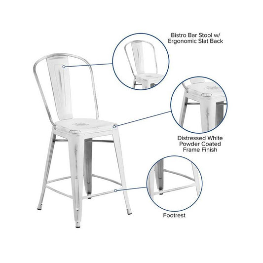 Commercial Grade 24" High Distressed White Metal Indoor-Outdoor Counter Height Stool with Back