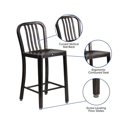 Commercial Grade 24" High Black-Antique Gold Metal Indoor-Outdoor Counter Height Stool with Vertical Slat Back