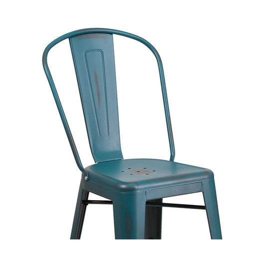 Commercial Grade 24" High Distressed Kelly Blue-Teal Metal Indoor-Outdoor Counter Height Stool with Back
