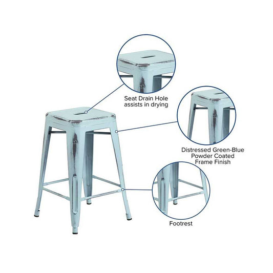 Commercial Grade 24" High Backless Distressed Green-Blue Metal Indoor-Outdoor Counter Height Stool
