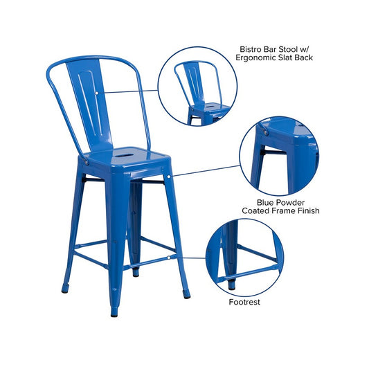 Commercial Grade 24" High Blue Metal Indoor-Outdoor Counter Height Stool with Removable Back