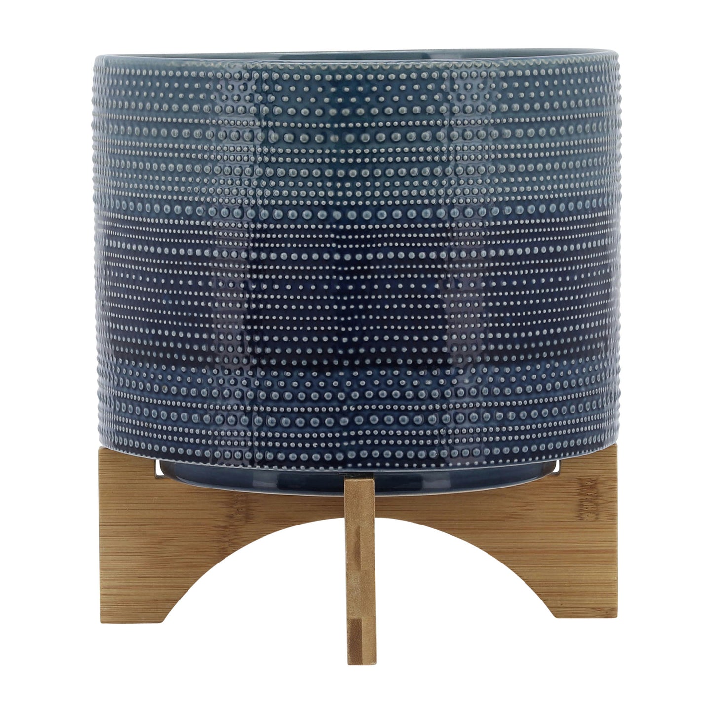 10" Dotted Planter W/ Wood Stand, Dark Blue