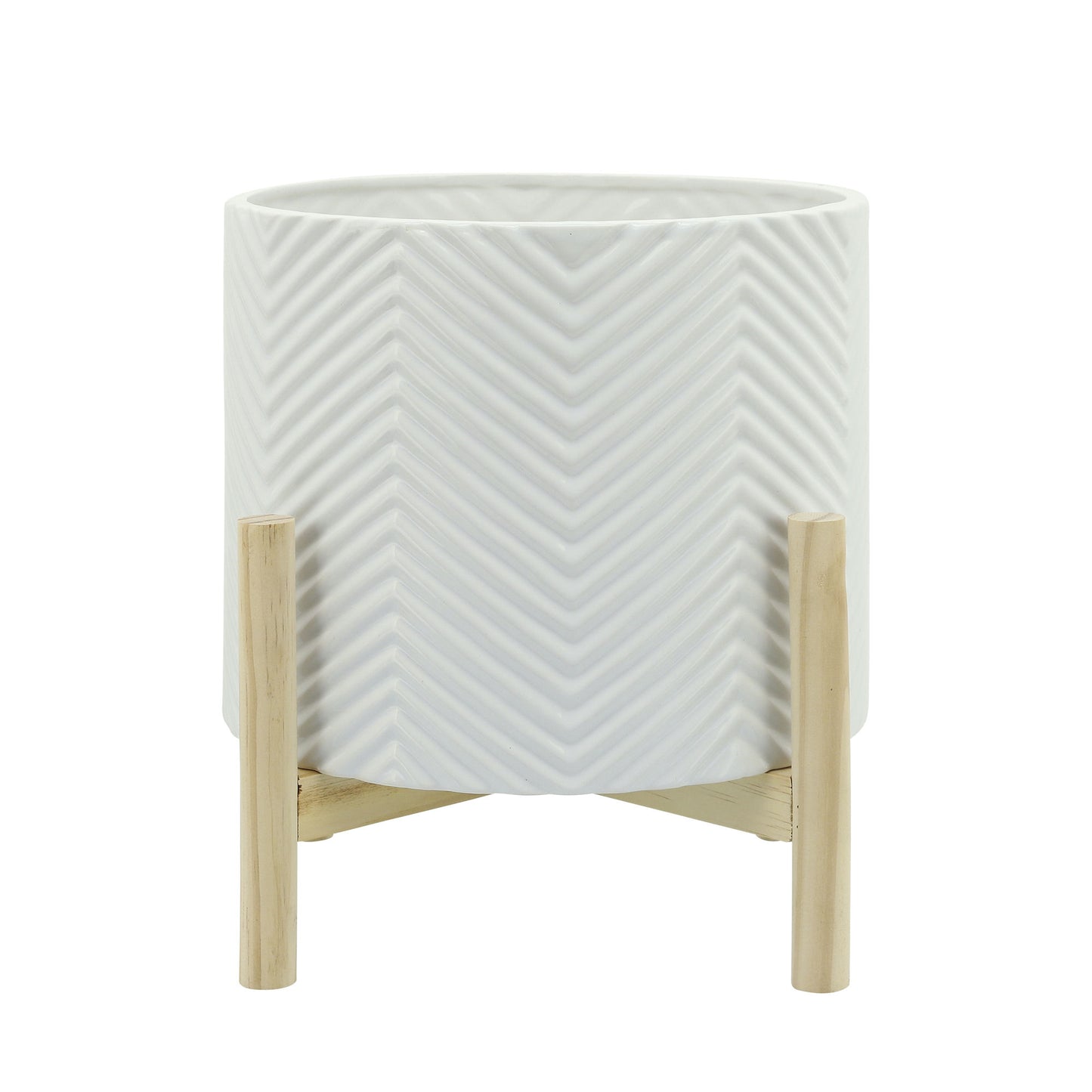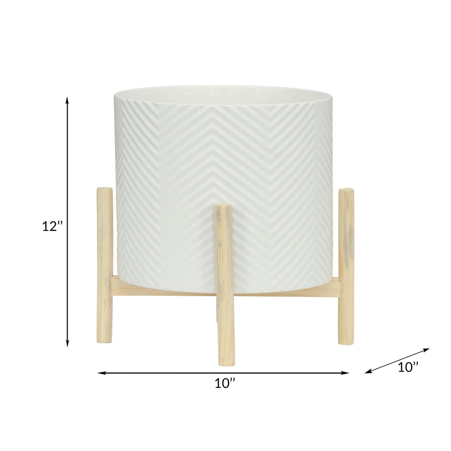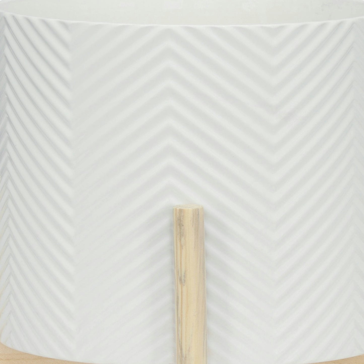 12" Ceramic Chevron Planter W/ Wood Stand, White
