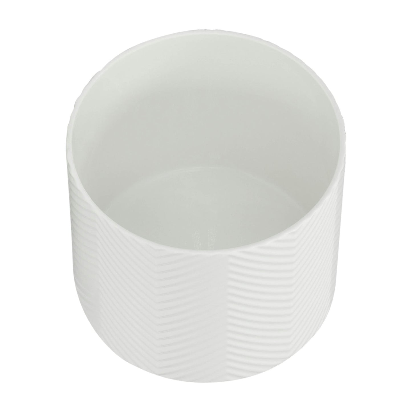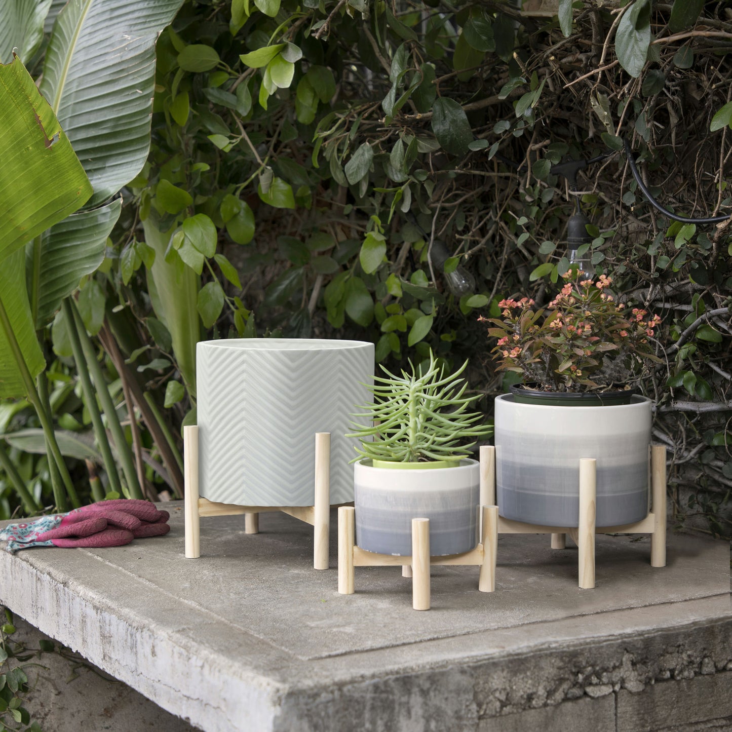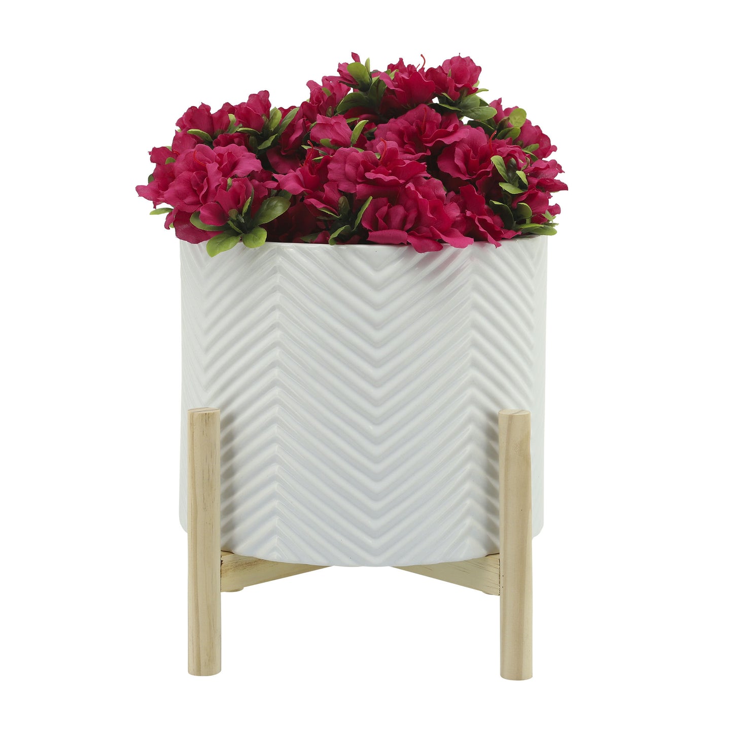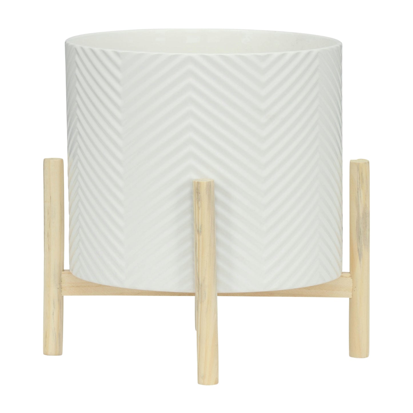 12" Ceramic Chevron Planter W/ Wood Stand, White