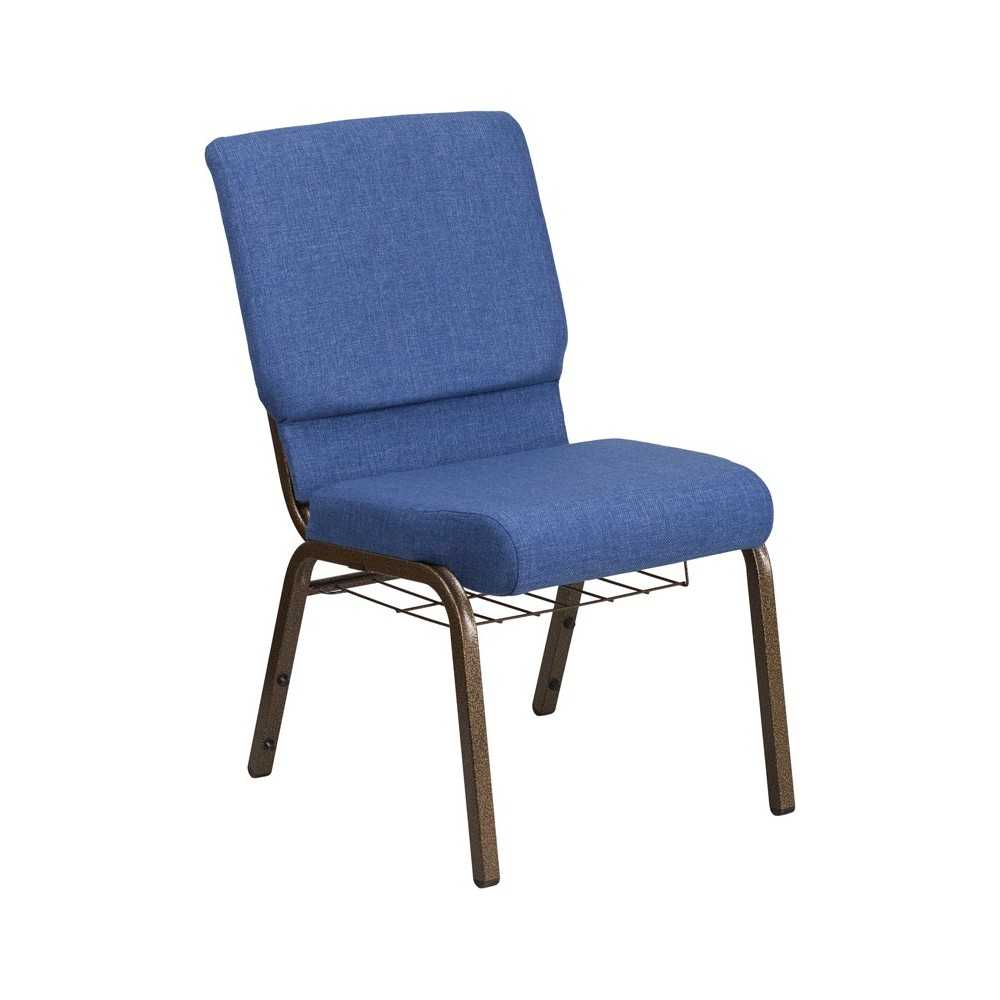 This beautiful, supremely comfortable church chair will ensure your guests have an enjoyable experience whether you're hosting an all-day seminar, serving a 10 course meal or delivering your most inspirational sermon. Unlike pew seating, these chairs give you the capability to create different seating configurations as often as you wish making them an ideal seating solution for any venue. The chair's 4.25"cushioned back and seat are generously padded and covered in durable fabric upholstery. The seat has a 4.25" waterfall edge that provides an extra level of comfort by reducing pressure on your attendees' legs. A convenient book pouch on the back of the chair keeps seminar materials, bibles or hymn books readily available and a book rack under the seat gives everyone a place to store their personal belongings. Built-in ganging brackets connect your chairs and maintain nice, straight rows. Its sturdy 16 gauge steel, gold vein frame, with gracefully angled legs, has been tested to hold up to 800 pounds and plastic rocker glides protect your floor by sliding smoothly when you need to move the chair. This chair is stackable for easy storage making it an excellent choice for event venues, hotel lobbies, banquet halls, conference facilities and worship centers. [FD-CH02185-GV-BLUE-BAS-GG]