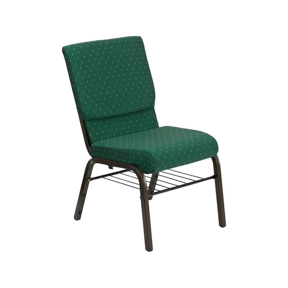 This beautiful church chair will keep your guests supremely comfortable whether you're hosting an all-day seminar, serving a 10 course meal or delivering your most inspirational sermon. This chair offers an advantage over pew seating with the flexibility of creating different seating configurations. The chair's cushioned back and 4" thick seat are generously padded and covered in durable fabric upholstery. The seat has a waterfall edge that reduces pressure on your attendees' legs. A convenient book pouch on the back of the chair keeps seminar materials, bibles or hymn books readily available and a book rack under the seat gives everyone a place to store their personal belongings. Built-in ganging brackets connect your chairs and maintain nice, straight rows. Its sturdy 16 gauge steel, gold vein frame, with gracefully angled legs, has been tested to hold up to 800 pounds and plastic rocker glides protect your floor by sliding smoothly when you need to move the chair. This Church Chair is an excellent option for hotel lobbies, banquet halls, conference facilities and worship centers. [XU-CH-60096-GN-BAS-GG]