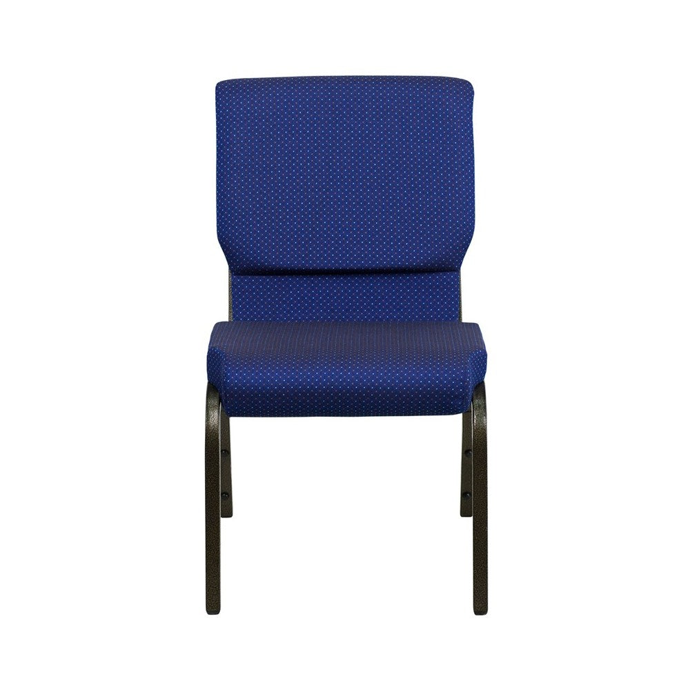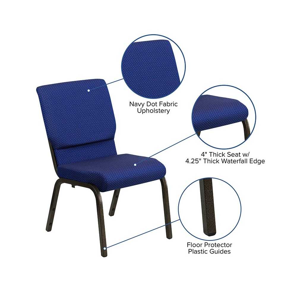 This beautiful church chair will keep your guests supremely comfortable whether you're hosting an all-day seminar, serving a 10 course meal or delivering your most inspirational sermon. This chair offers an advantage over pew seating with the flexibility of creating different seating configurations. The chair's cushioned back and 4" thick seat are generously padded and covered in durable fabric upholstery. The seat has a waterfall edge that reduces pressure on your attendees' legs. A convenient book pouch on the back of the chair keeps seminar materials, bibles or hymn books readily available. Built-in ganging brackets connect your chairs and maintain nice, straight rows. Its sturdy 16 gauge steel, gold vein frame, with gracefully angled legs, has been tested to hold up to 800 pounds and plastic rocker glides protect your floor by sliding smoothly when you need to move the chair. This Church Chair is an excellent option for hotel lobbies, banquet halls, conference facilities and worship centers. [XU-CH-60096-NVY-DOT-GG]