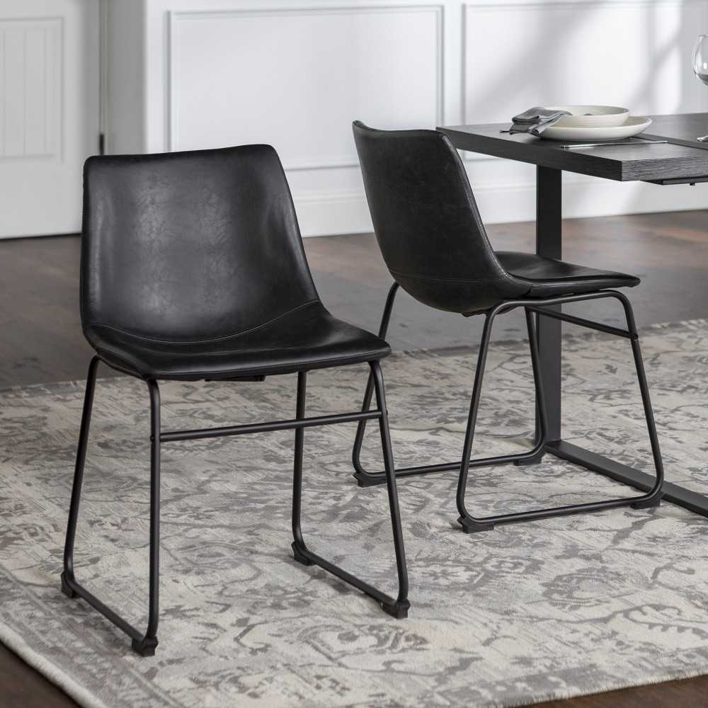 Bring the sophisticated look of leather seating to your kitchen with these faux leather dining chairs. They'll be the perfect addition to your eating space and are great for everyday use. The synthetic leather is soft to the touch, the curved seating provides comfort and the seat is supported by powder-coated steel legs for a durable, long lasting design. These chairs look best in an urban industrial styled space, but also can coordinate well with many other popular interior styles and can be used in home offices and living rooms as an accent chair.