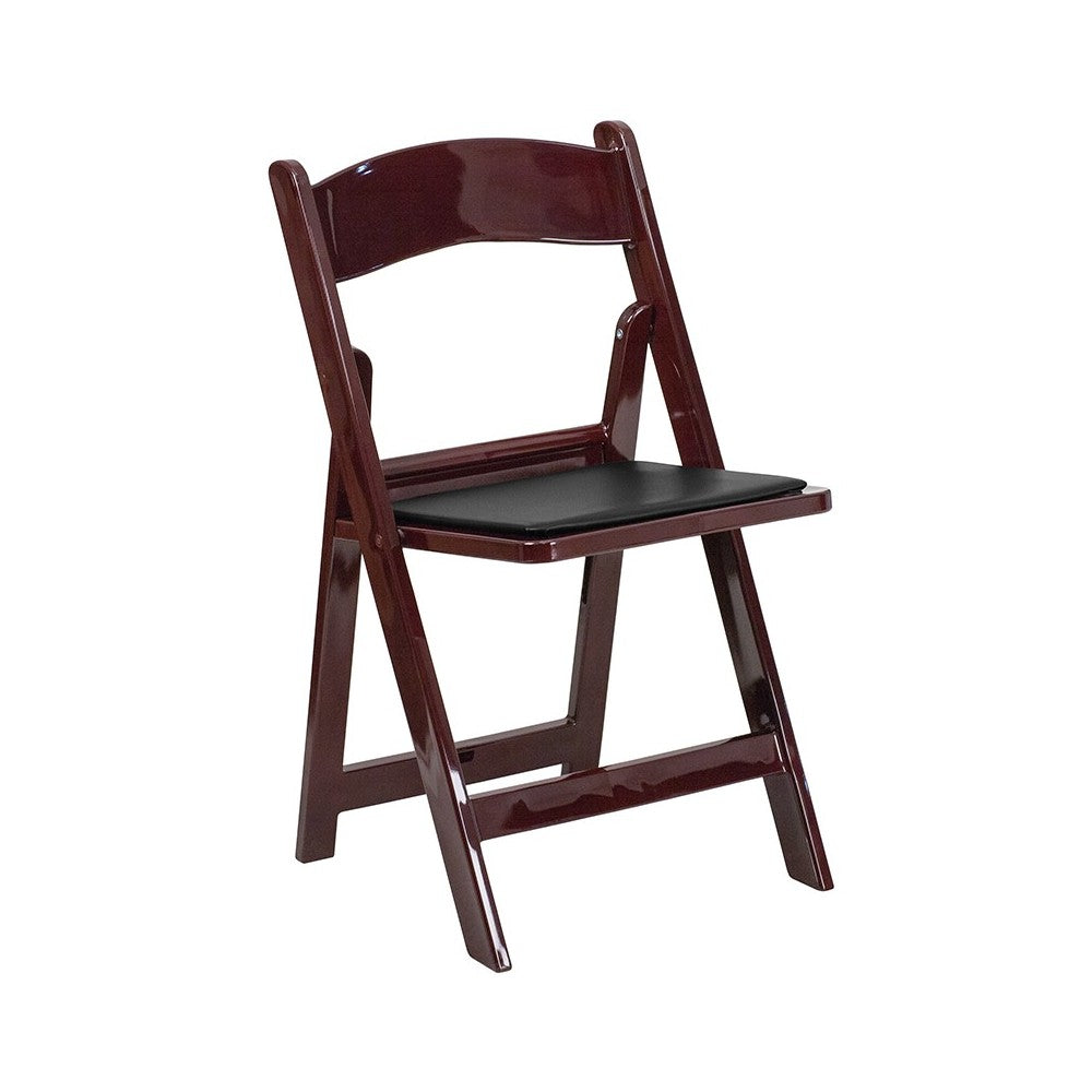 The Mahogany Resin Folding Chair combines comfort and elegance that looks good at all your special events, whether it's a backyard barbeque, a formal banquet or beach wedding. This chair is made from ultra-strong resin that's very lightweight, yet extremely strong and can hold up to 1000 pounds making this portable folding chair perfect for any social event, your home office or remote learning space. The smooth frame is double braced for added stability and the front brace can be used as a footrest. The color of the frame is the same all the way through, so you don't have to worry about nicks and scratches. No re-painting or staining is ever needed; your chairs will look great for years to come. The chair comes with a detachable, washable, waterproof seat cushion filled with fire retardant foam. The easy to clean, durable design of these chairs makes them the ideal choice for indoor and outdoor use. The chairs are portable and fold compactly to transport and store. [2-LE-L-1-MAH-GG]