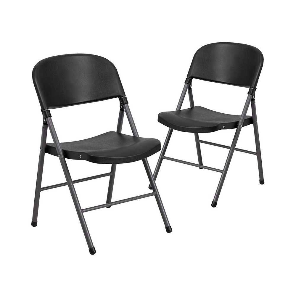Feel free to host the holidays this year or plan the perfect event or gathering with this Black Plastic Folding Chair with Charcoal Frame. A molded seat provides comfort to guests while the heavy duty frame supports up to 330 lbs. The textured seat ensures safe and comfortable seating. After use, place them on top of each other or in a row. You'll always have extra seating on hand for guests for game night, parties, and Thanksgiving and Christmas dinner. Plastic chairs offer a versatile seating solution while being easy to maintain and are designed for portability. [2-DAD-YCD-50-GG]