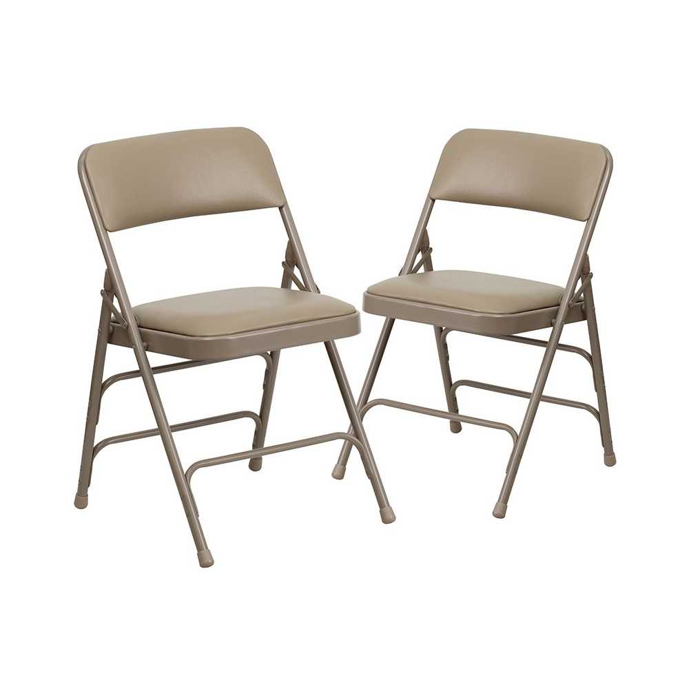 Host Thanksgiving at your house and leave out "bring your own chair" on the invite we've got you covered with these padded folding chairs. These heavy-duty metal folding chairs are built for commercial businesses who host a myriad of events and need to accommodate people of varying sizes. Portable chairs are ideal in community centers to transport from storage to venue floor. Change the scenery with these outdoor metal chairs by taking the party outside. Take care of your chairs so they last you many years by storing indoors. Its 18-gauge curved steel frame is triple braced with leg strengthening support bars to hold up to 300 pounds while the non-marring floor glides protect your flooring from scuffs and scrapes. Celebrate all family events at your home for guests to sit comfortably atop these upholstered folding chairs. These chairs come assembled to be of service as soon as they're delivered. [2-HA-MC309AV-BGE-GG]